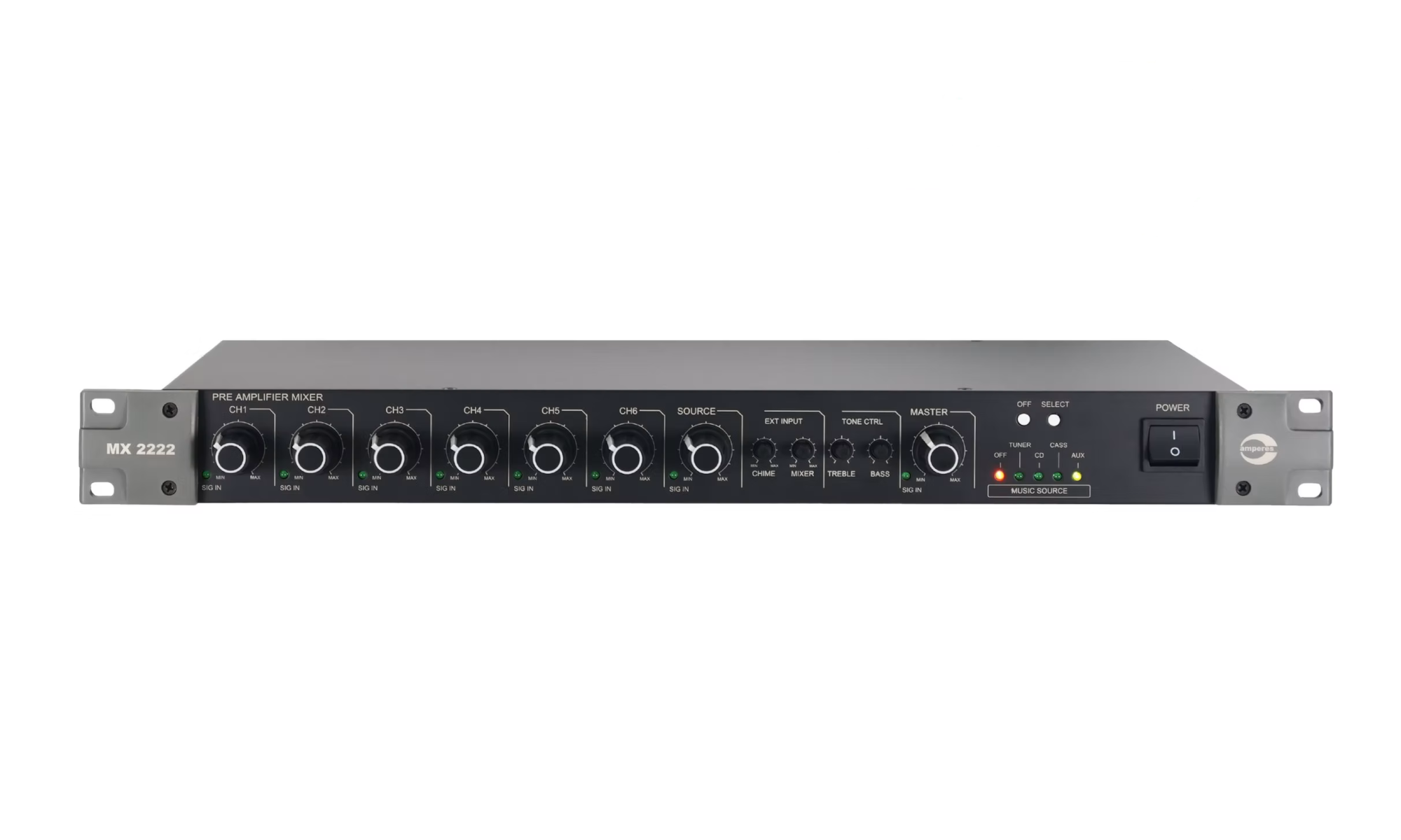 The Amperes MX2222 Preamplifier feature a dual output for uninterrupted paging setup, like BGM and paging announcement. Adjustable priority muting level is available for paging announcement to override BGM and other lower priority sources. The PA Mixer also comes with 12V phantom power supply for microphone input.